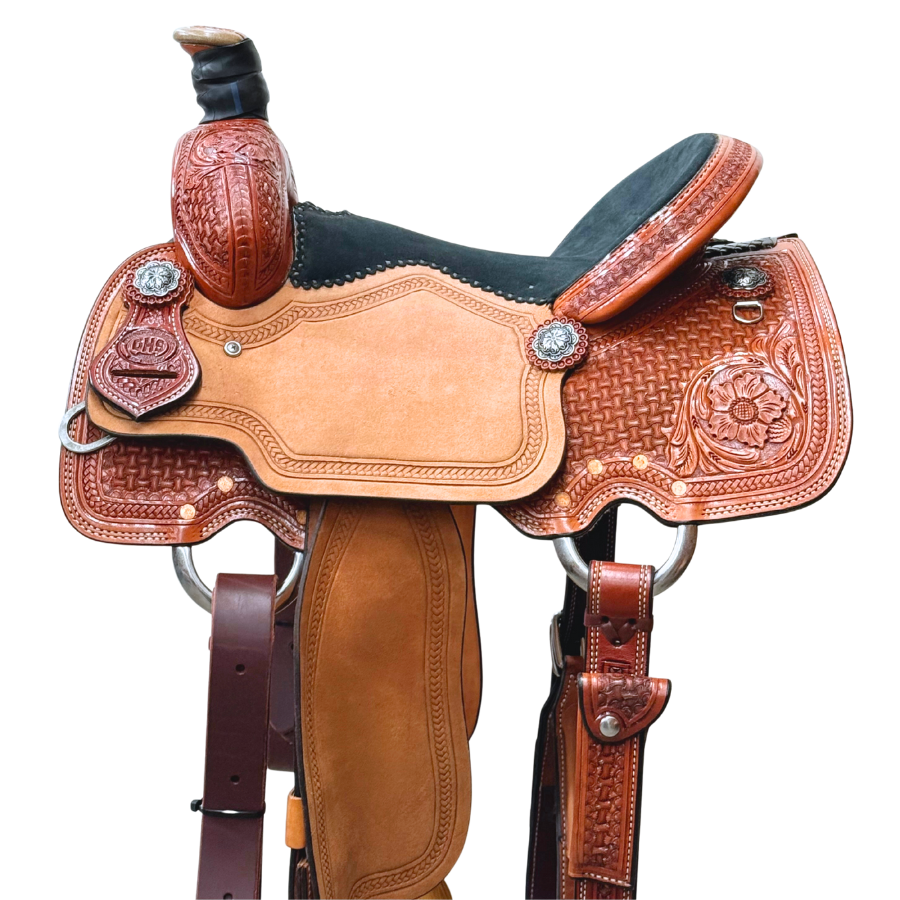 The All Around tree is narrow in the seat for a comfortable ride. We usually make this tree into a lightweight saddle that weighs around 30 pounds for easy handling. The bars in this saddle are heavy enough for team roping, and you can run barrels as well as other speed events. This saddle is very comfortable to trail ride in as well.