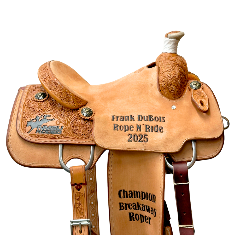 DHS trophy saddle for the Frank DuBois Rope N’ Ride champion breakaway roper. Looking to order trophy saddles for your next event? Reach out to Corky at 480-585-4073.