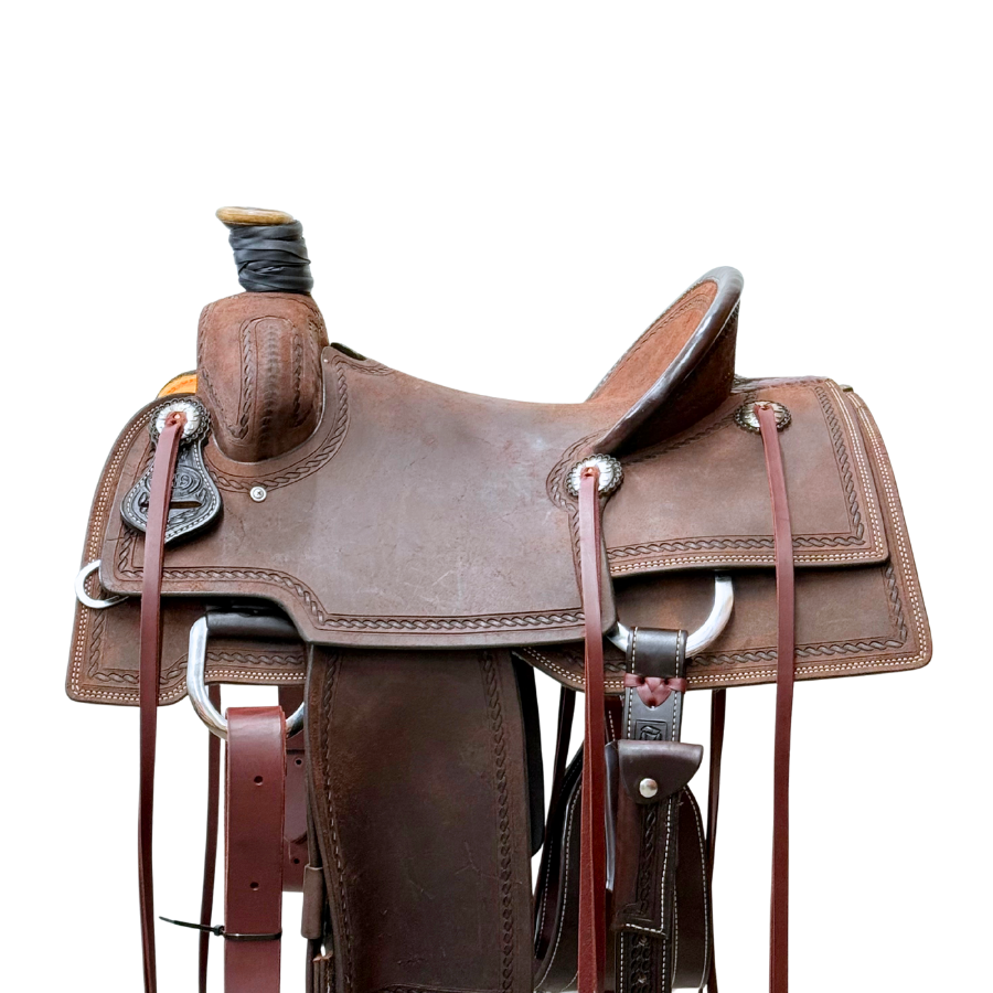 Tree: Hogg Size: 15″ Seat: Hard Cantle: Pencil Roll Texture: Chocolate Rough Out